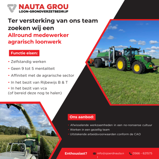 Ter versterking van ons team zoeken wij een Allround medewerker agrarisch loonwerk